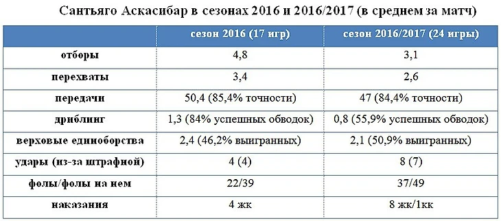 Аскасибар – очень резкий и агрессивный игрок. В завершившимся сезоне Сантьяго в среднем за матч предпринимал 4 попытки отбора – в РФПЛ так часто в отбор вступали Полуяхтов, Пирис и Ещенко. Нередко он возвращает мяч своей команде после успешно выполненного подката, но у этого есть и обратная сторона – иногда Аскасибар оказывается обыгран оппонентами (в сезоне-2016 его обыгрывали в среднем за матч 1,3 раза, в чемпионате-16/17 – 1).