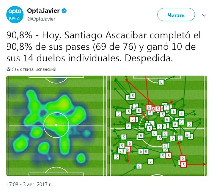 90,8% - сегодня Сантьяго Аскасибар пасовал с точностью 90,8% (69 передач из 76) и выиграл 10 единоборств из 14. Прощай.