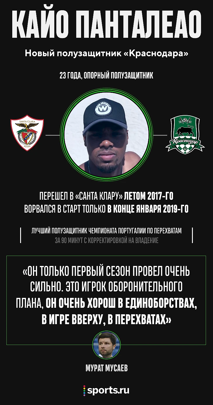 Кайо – опорный полузащитник, в этом году ему исполнится 24. О жизни новичка «Краснодара» практически ничего неизвестно: он дал всего одно интервью (при переходе в «Санта Клару»), где рассказал, что ему нравятся Погба, Паулиньо и Яя Туре. Бразильские и португальские медиа не делали материалов по Кайо – с ним мы будем знакомиться уже в России.