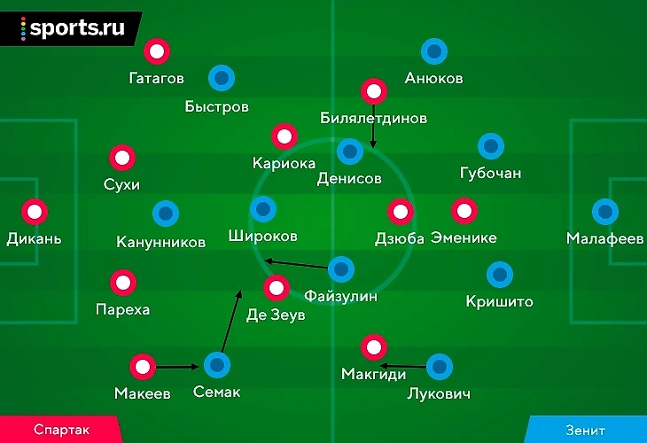 Конечно, функции фланговых полузащитников «Зенита» сильно различались. Быстров постоянно держал ширину – например, из-за этого не так ярок в атаке был Александр Анюков. У Семака была более важная роль: когда «Спартак» коротко разыгрывал мяч от ворот (а также, когда левый защитник Гатагов пасовал назад на Марека Сухи), Сергей выдвигался к Парехе, а за правого защитника москвичей Макеева отвечал Лукович.