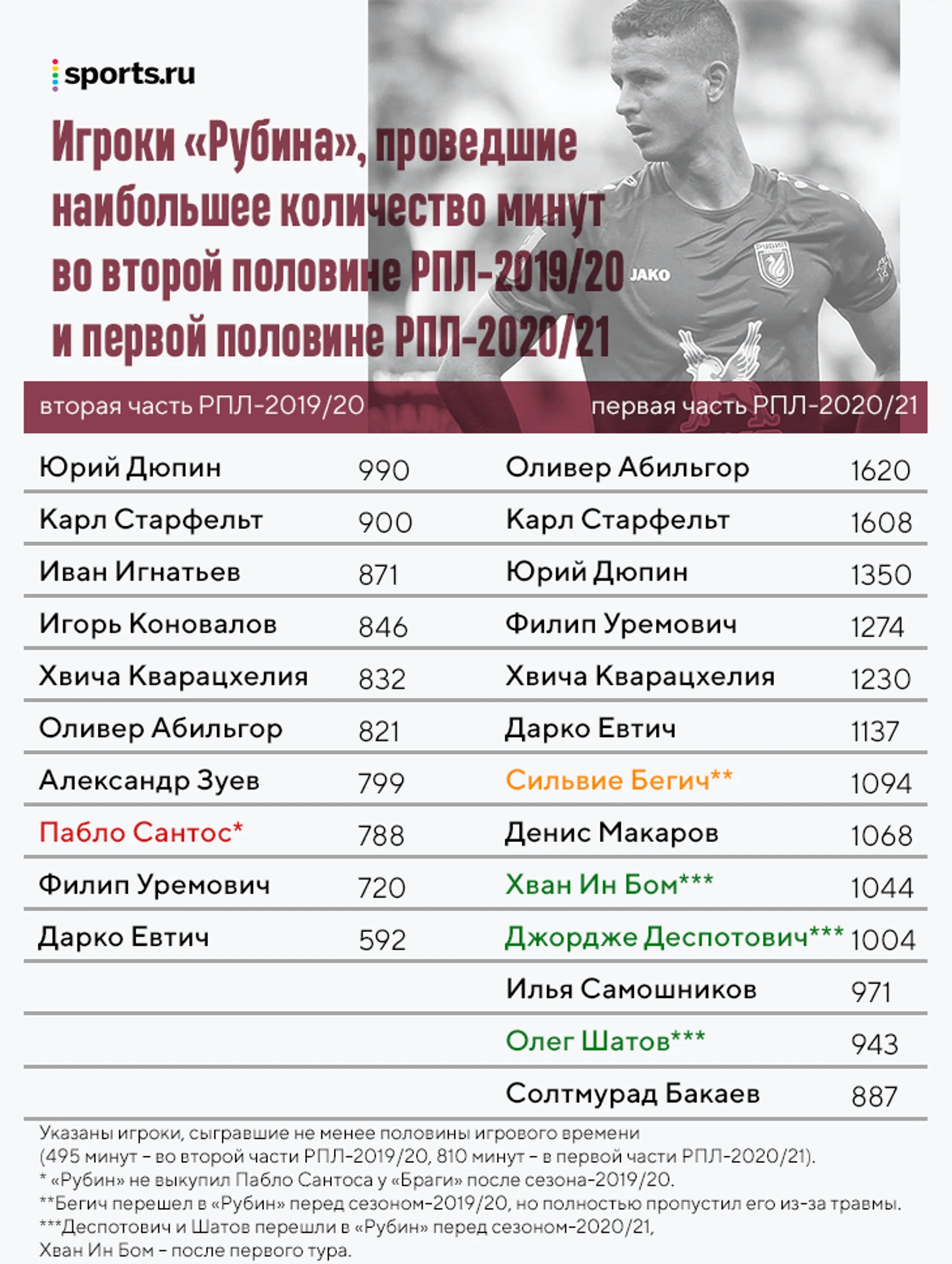 Хван и Деспотович стали системообразующими игроками «Рубина» и сильно повысили качество игры в середине поля и атаке. В первой части сезона-2020/21 Деспот забил 6 голов с игры (7-е место в лиге, естественно, первый в команде), а Хван стал лучшим в команде по продвижению мяча в финальную треть и непрямому участию в атаках с ударами. То есть индивидуально они дали результат сразу, без сборов.