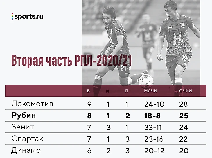 Весной 2021-го «Рубин» резко попер вверх: обыграли «Спартак» (2:0), «Зенит» (2:1), «Сочи» (1:0) и «Динамо» (2:0). В топ-матчах казанцы потеряли очки лишь однажды – поражение от «Краснодара» (0:1).