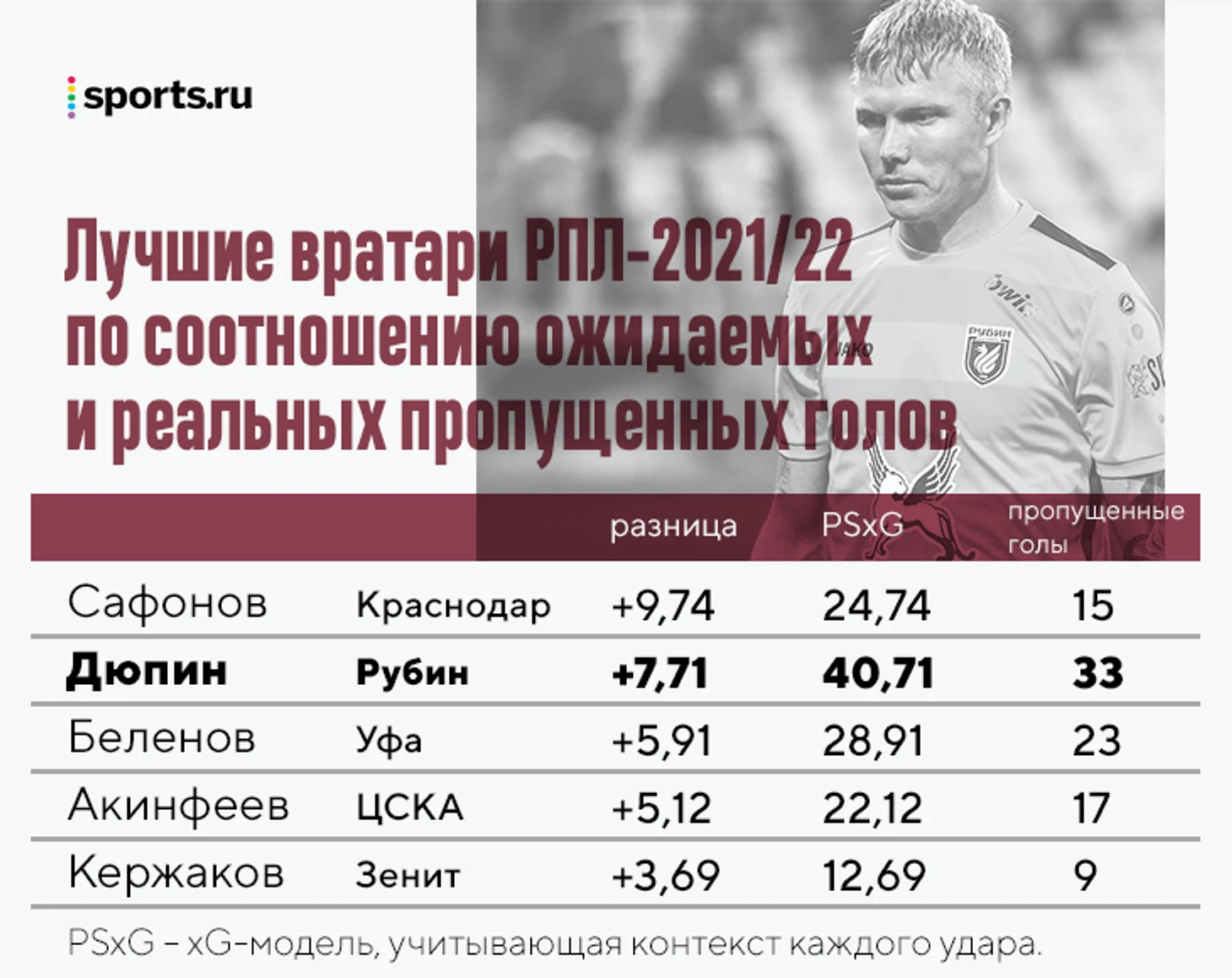 После 22 туров «Рубин» – десятый, а по ожидаемым очкам вообще четырнадцатый, позади только «Нижний Новгород» и «Арсенал». Вероятно, в реальной таблице казанцы были бы ниже, если бы не сильный сезон Дюпина на линии ворот.