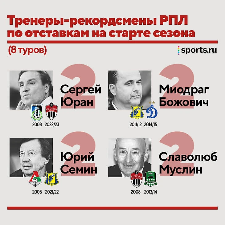 Юрий Семин, Сергей Юран, Славолюб Муслин и Миодраг Божович по два раза покидали команды на старте сезона.