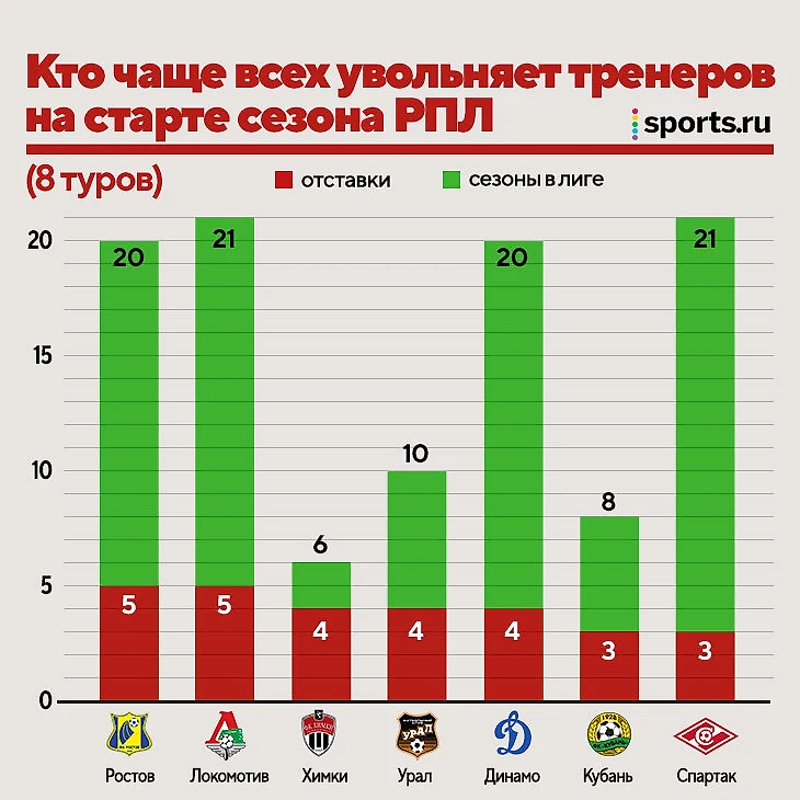 До нынешнего сезона в стартовых восьми турах РПЛ в среднем увольняли 2,15 тренера. В десяти чемпионатах лишались работы по два тренера, в трех – по три.