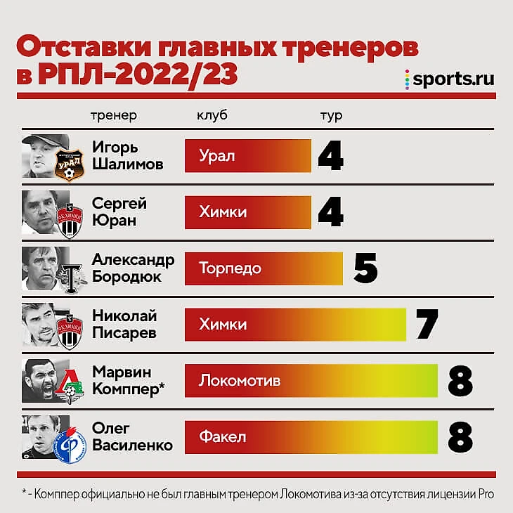Новая неделя в РПЛ – новые тренерские отставки. После восьмого тура «Локомотив» расстался с Марвином Комппером (официально был ассистентом Джо Циннбауэра, в реальности – главным тренером), а «Факел» – с Олегом Василенко.