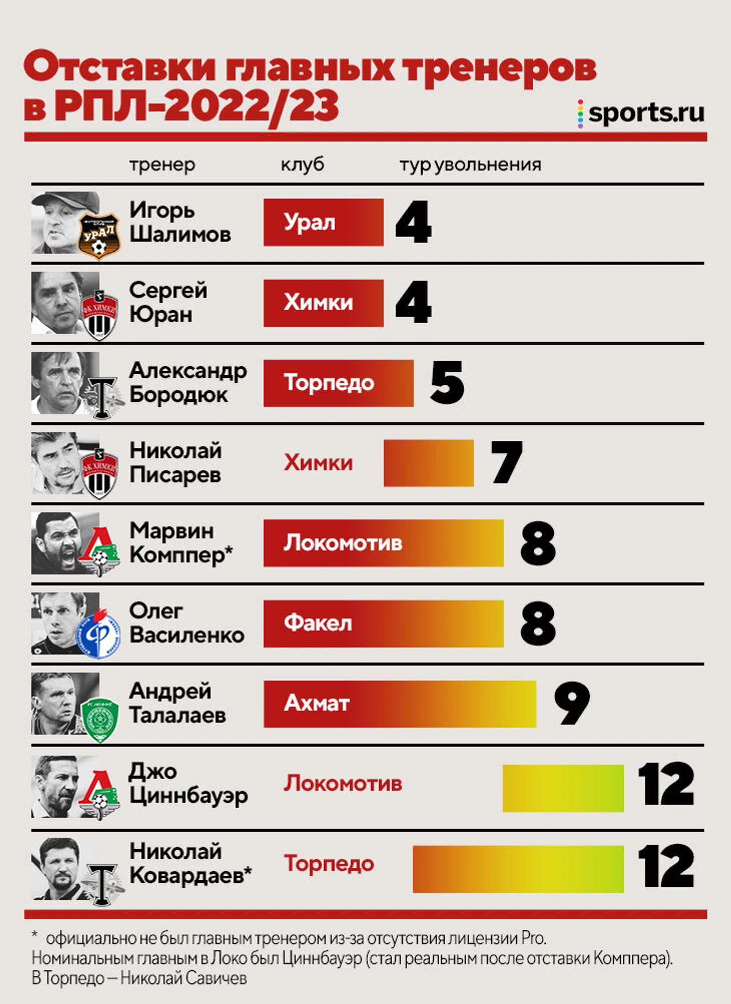 После этого в РПЛ случился месяц затишья – только «Ахмат» расстался с Андреем Талалаевым. После 12-го тура – новая буря. «Локомотив» уволил Джо Циннбауэра (а также спортивного директора Томаса Цорна), а «Торпедо» заменило Николая Ковардаева (у него нет лицензии Pro, поэтому формальным главным был Николай Савичев) на Талалаева.