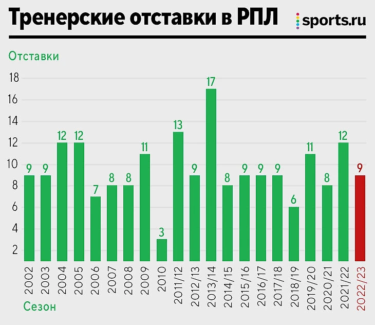 В семи полных сезонах РПЛ было меньше отставок, чем в этом – за 12 туров, в шести – столько же. Этот сезон мощно двигается ко второму месту по количеству тренерских перестановок. До рекорда чемпионата-2013/14 (17 отставок) дотянуться сложно, но возможно.
