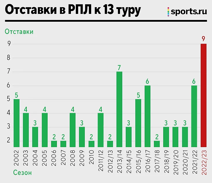 Девять отставок за 12 туров – рекорд РПЛ. Такого не было даже в сезоне-2013/14, когда «Анжи» нарисовал три отставки за четыре тура – Гуса Хиддинка и Рене Меленстена у себя, а также Гаджи Гаджиева, который вернулся в Махачкалу после резкой смены курса клуба (работал в «Крыльях Советов»).