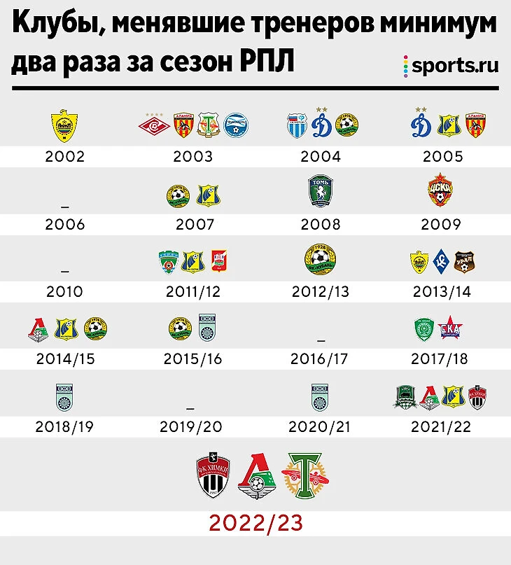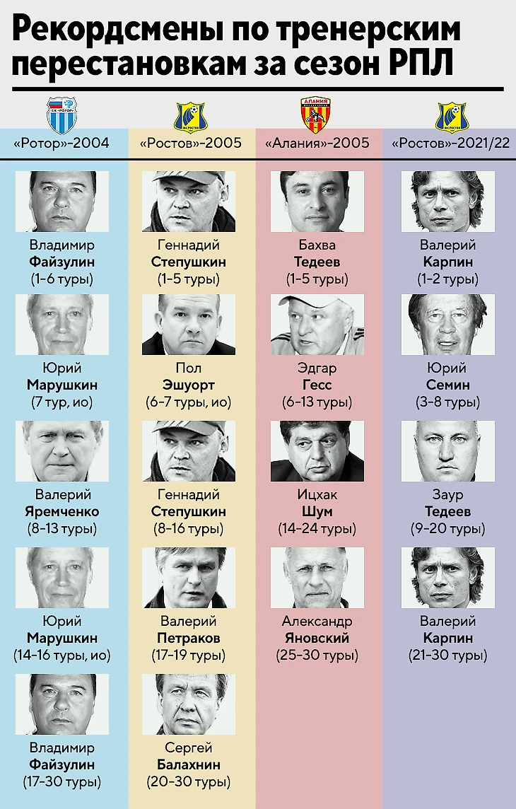 По три раза тренеров меняли «Алания»-2005 и «Ростов»-2021/22. У ростовчан уникальная история, потому что все полетело из-за сборной России. Прямо перед стартом сезона-2021/22 Карпин согласился совмещать работу в сборной и клубе, но уже после второго тура понял, что нужно сосредоточиться на национальной команде. Во второй части чемпионата Карпин вернулся в «Ростов» после отстранения России от официальных матчей.