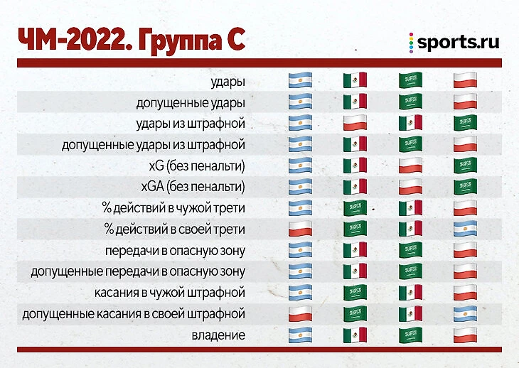 Более того, поляки – одни из худших на всем ЧМ-2022. Предпоследние по ударам (меньше лишь у Коста-Рики), 30-е – по допущенным ударам, 30-31-е – по действиям в своей трети, 31-е – по действиям в финальной трети и владению. Фактически Польша одновременно плохо оборонялась и атаковала – и провела одновременно счастливый и ужасный групповой этап.