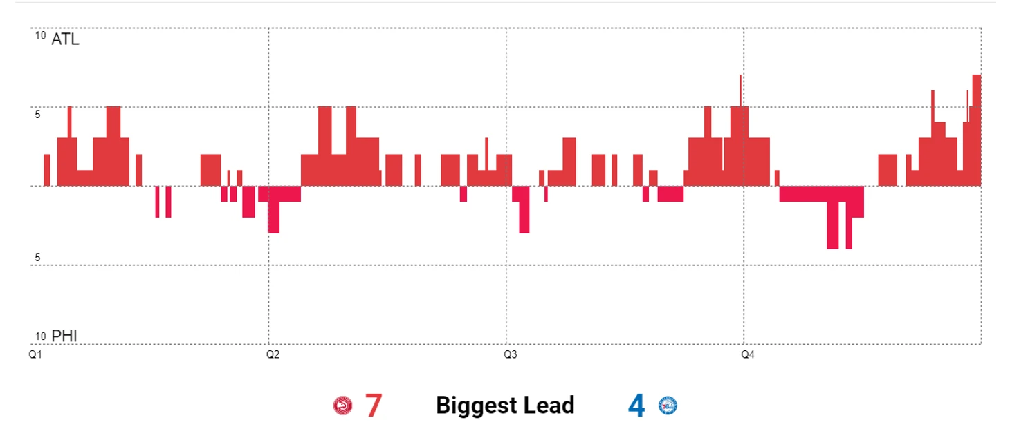 2 из 16 с игры и 4 потери от главной звезды гостей за первые 36 минут встречи, из которых Трэй провел на площадке 32,5, позволяли «семьдесят шестым» создать комфортный задел в счете. Однако «Сиксерс» так и не смогли воспользоваться провалом соперника и подарили нам очень упорное противостояние. Лидер матча менялся 20 раз, при этом самого большого 7-очкового отрыва добились как раз «Хоукс».