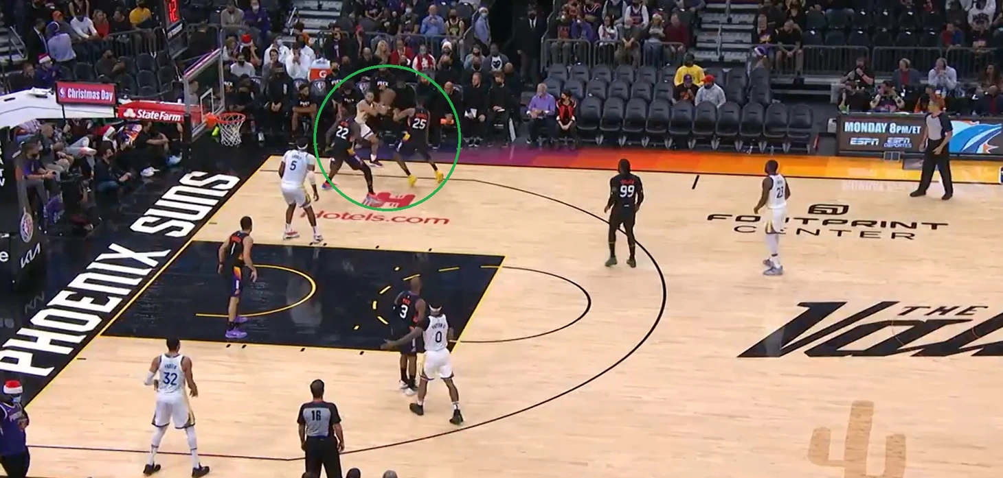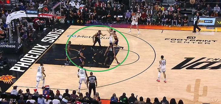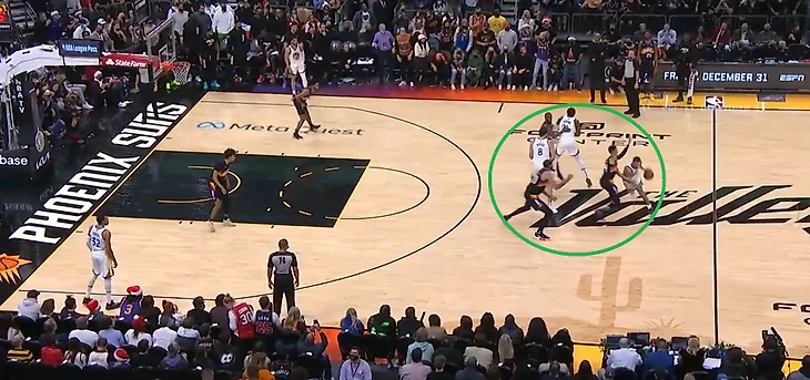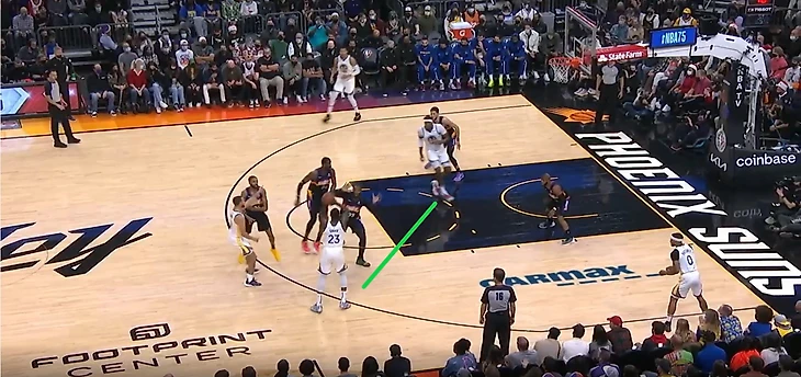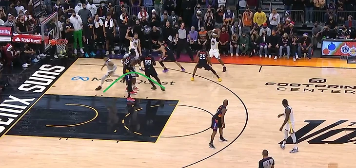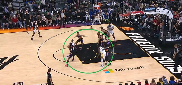 Даже стоящий без движения и с персональным защитником Карри приковывает к себе внимание других игроков обороны. В данном моменте Портер выбежал из-под заслона Луни. Опекавший Отто Краудер не сразу же погнался за своим назначением, а на мгновение притормозил рядом со Стефом, поскольку следил за ним (был развернут лицом к Карри) и остерегался оставлять его один на один против Девина Букера. Этой доли секунды оказалось достаточно горячему Портеру, чтобы комфортно получить мяч и совершить бросок.