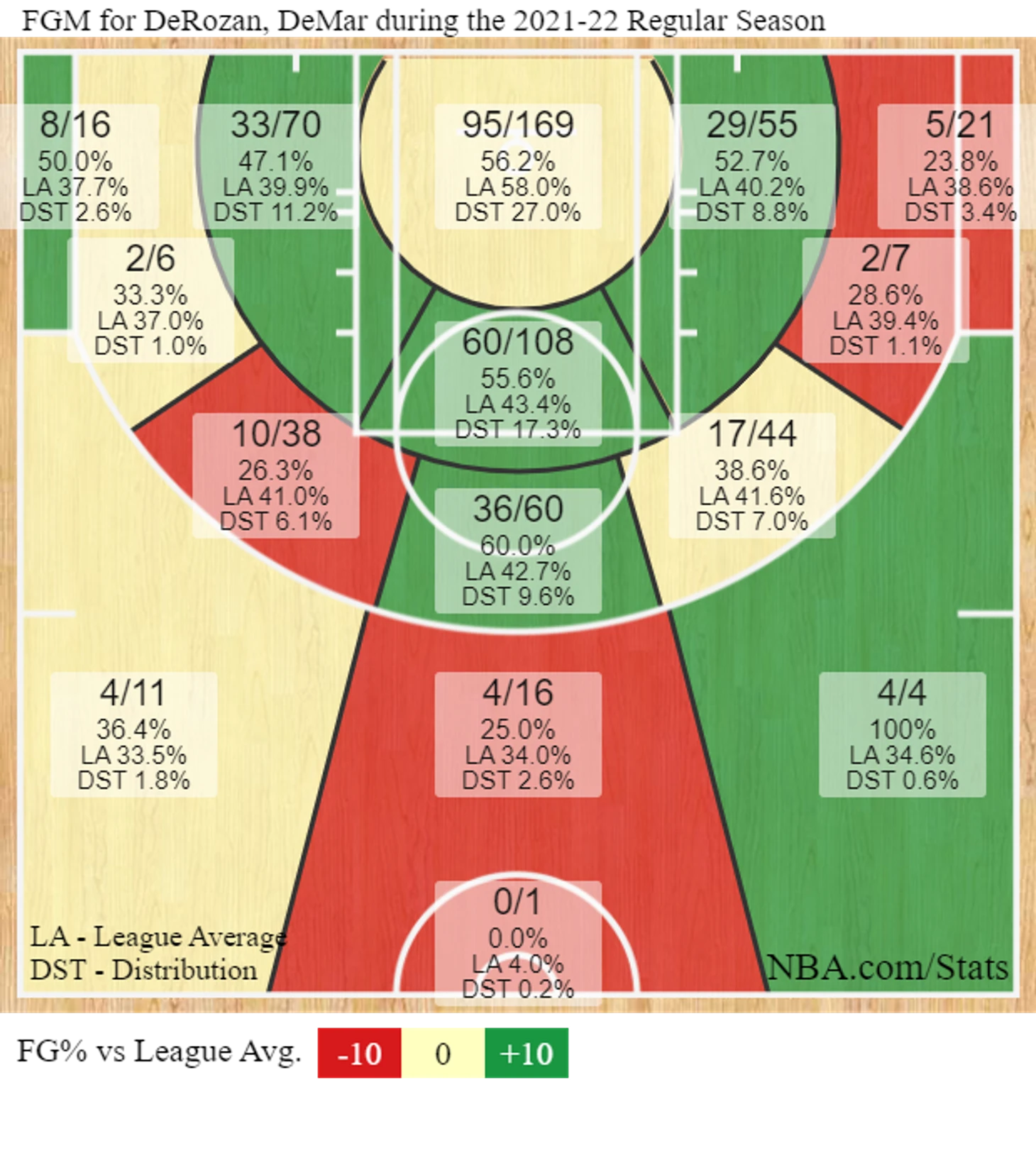 Дерозан является абсолютным лидером сезона по количеству точных бросков со средней дистанции: в среднем 4,2 за матч против 3,9 у Кевина Дюрэнта. Для сравнения: в прошлом году, когда форвард играл в худшей команде НБА по количеству трехочковых попыток, что сильно сужало пространство для атаки внутри дуги, он попадал только 2,6 таких броска.