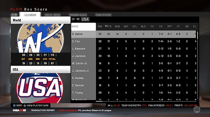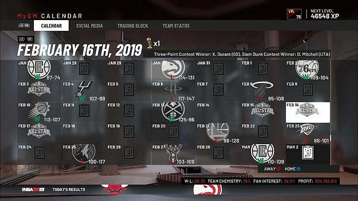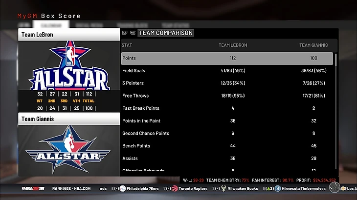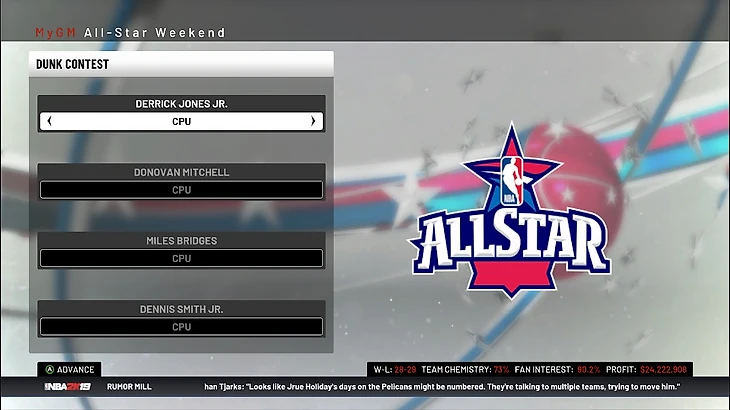 Кстати о звездах. С 15 февраля начинается All Stars Weekend! Так что не осветить такое событие в симуляции было бы очень глупо с моей стороны. Все мероприятие делится на 3 дня. В первый день идет матч Восходящих звезд, сборная США против сборной Мира. Во второй день идут Данк контест и Конкурс 3-очковых бросков. И в заключительный день идет самое главное мероприятие – Матч всех звезд, команда Леброна против команды Янниса.