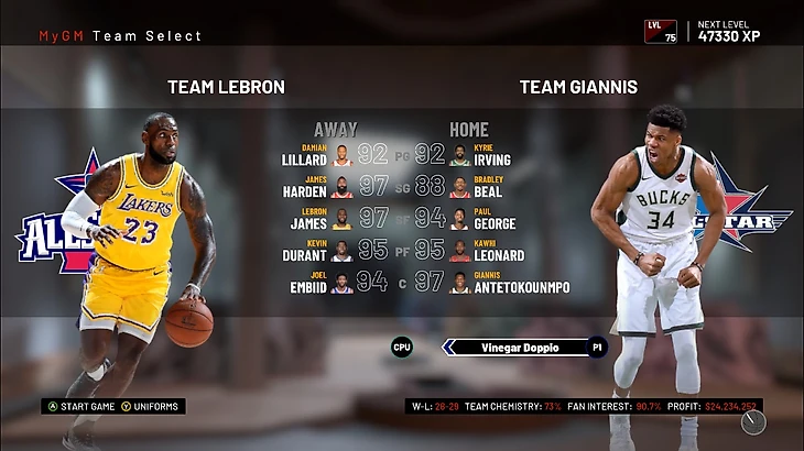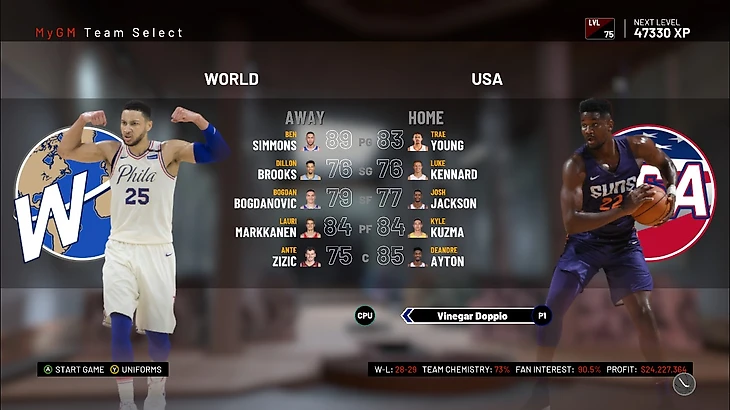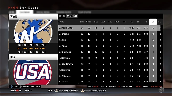 Что ж, данные составы уже вызывают некоторые вопросы. Начнем с самого главного: где Дончич? Ответ: у него травма. Но иногда игра считает, что ему не место и рядом с новичками, и на матче Восходящих. Что здесь делает Симмонс? Написано, что он только 2 года как в лиге. А компьютер в матч Восходящих берет тех, у кого 1 или 2 года в лиге. Так что он – восходящая звезда. Для меня же интерес вызывает Богданович и то, как он себя покажет в матче. Статистику матча я, конечно, покажу.