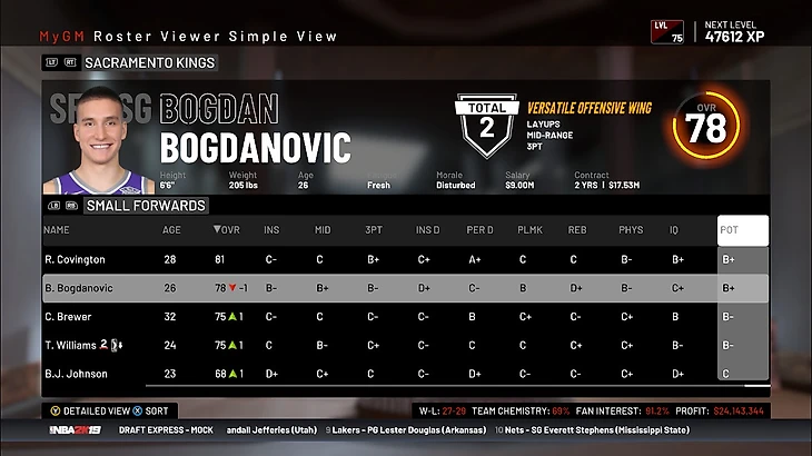 Вот с легкими форвардами сложнее: Ковингтон сейчас основной, но года через 2-3 уже сдаст позиции, Богданович мне абсолютно не нравится и он у меня первый кандидат на обмен (для его 26 лет уже поздно прогрессировать), про Брюэра я уже сказал все, а остальные двое мне не очень нужны. Поэтому план максимум – в лотерее драфта забраться высоко и выбрать хорошего форварда. Или попытать счастья на рынке СА.