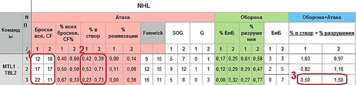 Как только Монреаль стал добавлять в активности и пытаться играть конструктивно, Тампа получила преимущество. Это отслеживается по всем метрикам, даже по заблокированным броскам. Особенно это видно по сумме обороны и атаки (отмечено красным 3): 0.5 против 1.5 в третьем периоде, разница в три раза!