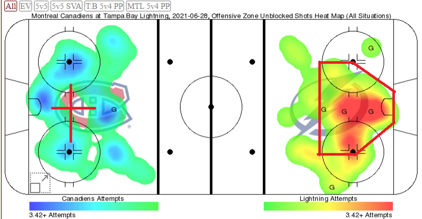 По тепловой карте видно разницу в рисунке игры в атаке. Подворотная игра Тампы против набросов и ближнего пятака Монреаля. Канадиенс перед воротами Василевского нарисовали крест, в центре которого зияет пустота. А основаная активность и опасность Тампы исходила именно из слота.