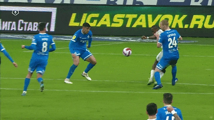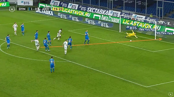 Не прошло и минуты, как тот же Денис входит в штрафную соперника и начинает накручивать одного защитника. После обыгрыша четвёртого из них мяч оказывается у Захаряна, и только невероятный сейв Гудиева спасает гостей от пропущенного мяча!!! Не смотрел другие матчи, но по мне это пока сейв тура! В заметках у меня написано: Мака +, Заха +, Гудини ++.
