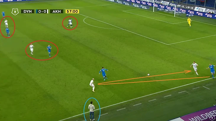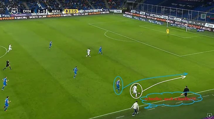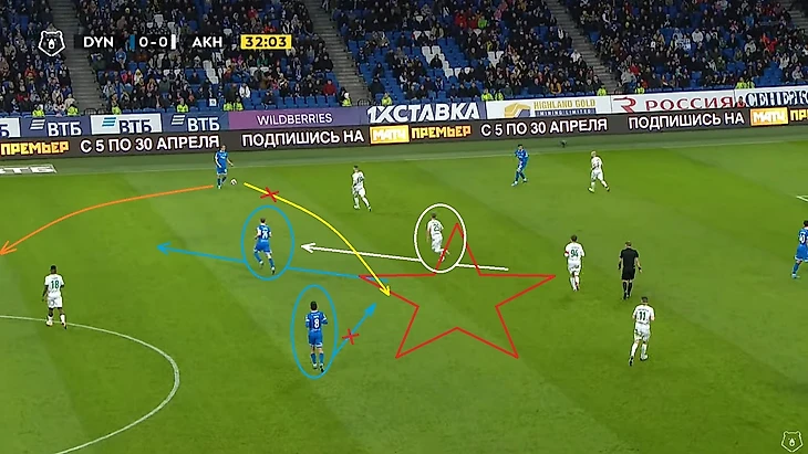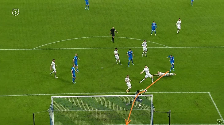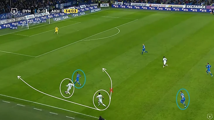 Сразу стоит отметить, что в этой игре я не заметил явных позиционных ошибок с нашей стороны, как раз наоборот игроки грамотно входили в свободные зоны, освобождаясь от опеки. На том же фото выше видно как Фомин подключается по центру и было бы ещё лучше, если бы Моро подошёл к нему поближе, а розыгрыш мяча оставил бы защитникам. Первый опасный момент мог получиться уже на четвёртой минуте, но Фомин вместо того, чтобы отдать простую передачу налево, решил усложнить атаку забросом на Макарова — неточно.