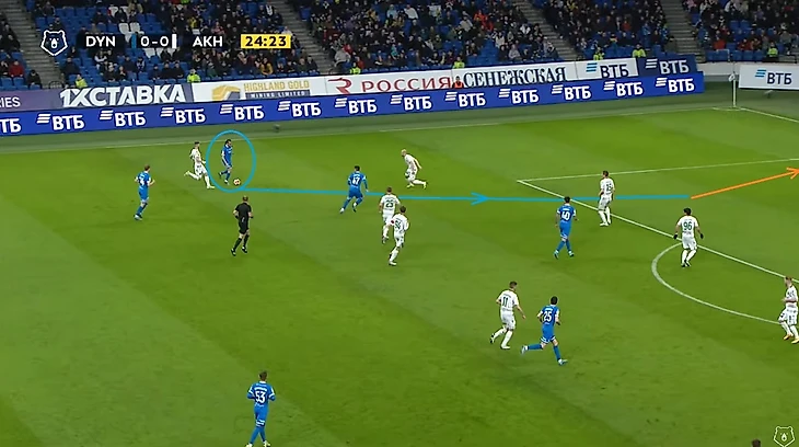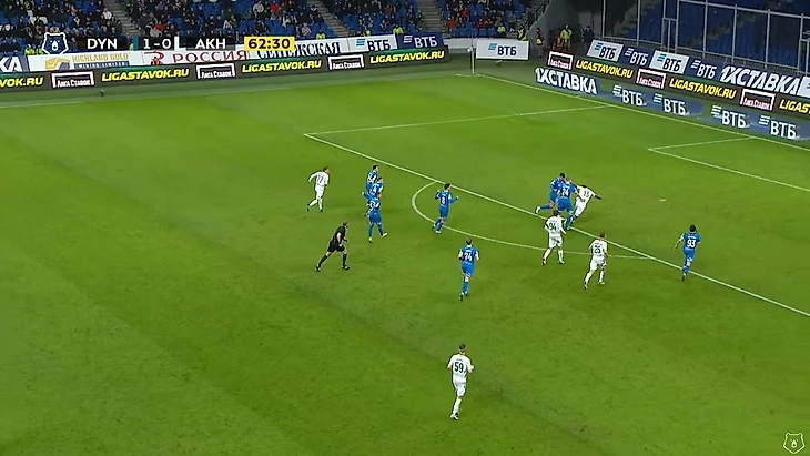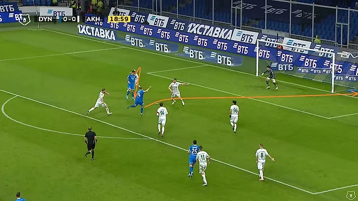 До 20-ой минуты Динамо безоговорочно владело инициативой, и лишь во второй трети часа гости вспомнили, что футбол это не только оборона собственных ворот. Босниец Тодорович попытался на дриблинге войти в нашу штрафную, но Бальбуэна уверено сыграл в подкате. После повторного углового мы отлично убегали в контратаку по центру, однако Фёдор не смог выкрутить пас на набегающего Захаряна. Обратите внимание, как быстро грозненцы вернулись домой: