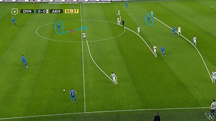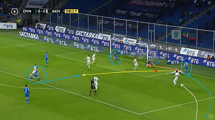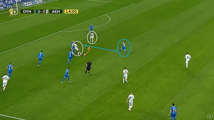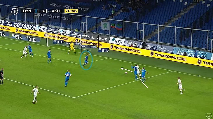 Против такой плотной обороны Динамо часто использовало забросы не только для того, чтобы напрямую вывести игрока на ударную позицию, но и чтобы подбирать отскакивающие мячи от игроков в белой форме. Как раз в таком стиле Арсен забил победный гол Арсеналу в Туле. Когда же у Ахмата образовывались свободные зоны слева, то туда часто смещался Паршивлюк. К сожалению, в одном из эпизодов очень сильно в недодачу отпасовал Шиманьски. В целом этот матч поляк провёл на среднем уровне, похуже, чем в предыдущем туре. Поэтому неудивительно, что он был заменён по истечении 70 минут. А вообще, это лишь его шестая замена в 21-ой игре, в которых он начинал в старте (игра против Уфы не в счёт). Ещё лучше был момент Фомина на 20-ой минуте, но Даниил в очередной раз не смог подстроиться под мяч и нанёс корявый удар мимо ворот (не в обиду Дане, но удар получился действительно корявым). Снова отметим скидку Смолова после навеса Макарова: