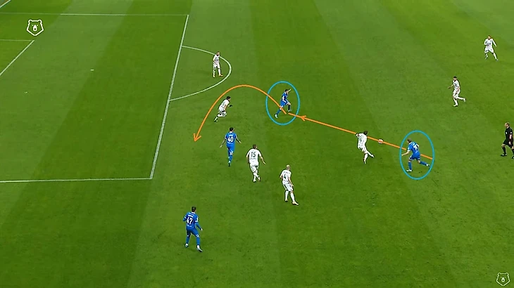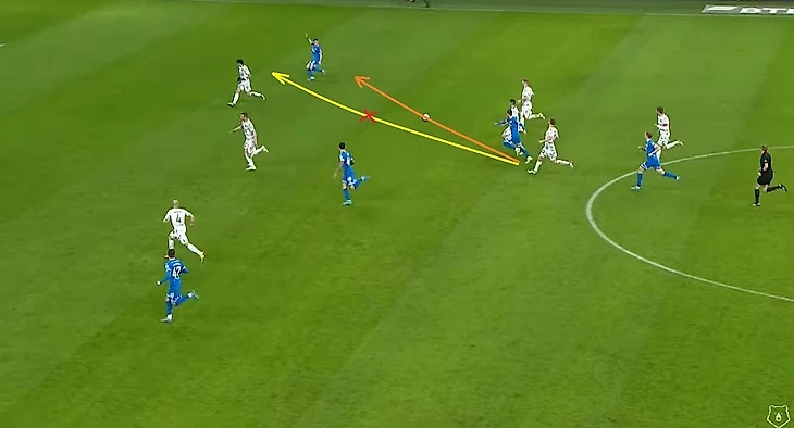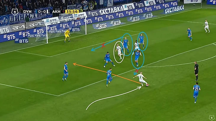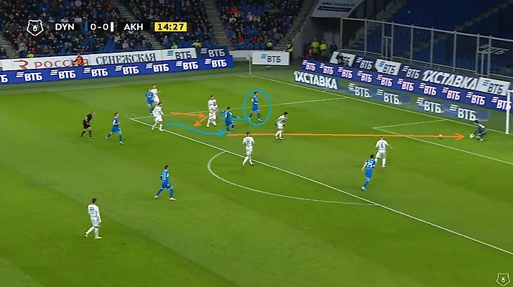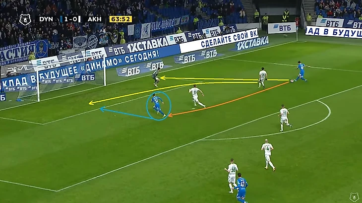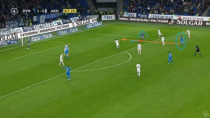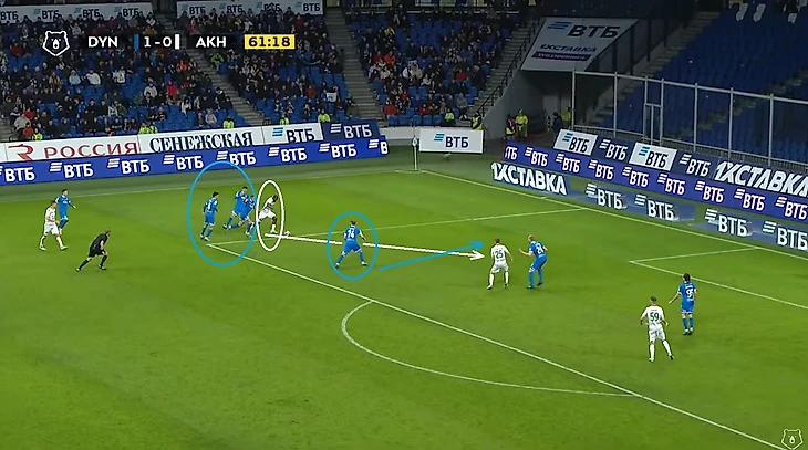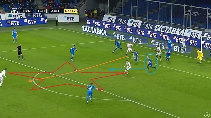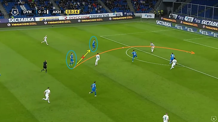 Вообще это сложная атака для оценки. Задумка была неплохой, но на Арсене уже «висело» два защитника. Можно было или пасовать на Макарова, или идти дальше, но для этого Макаров должен был уводить своего защитника правее. А вот за следующий эпизод Моро заслуживает похвалы — Николо не только открылся в свободной зоне, но и отблагодарил Паршивлюка пасом в одно касание: