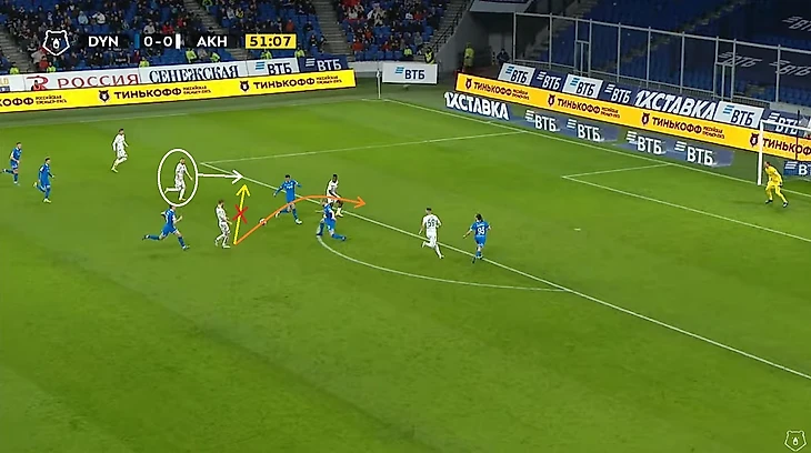 Минутой позже Моро снова отправляет нашего игрока в забег справа, но Смолов почему-то не навязал борьбу оппоненту. Инициатива вернулась к нам, но часто не хватало последнего паса. А вот пример того, как Фомин грамотно уводит опекуна, давая возможность Николе войти в образовавшуюся свободную зону, но вместо этого мы решаем играть через защитников: