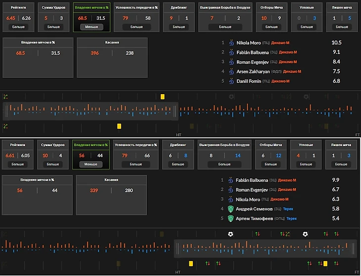 Второй тайм. После перерыва необходимости в заменах не было: Динамо контролировало ход игры, были полумоменты, Ахмат же создал свой момент играя вторым номером. Если не смотреть на итоговый результат, то лично я считаю, что этот тайм мы сыграли немного хуже, но только потому, что позволили играть Ахмату: я насчитал шесть достаточно опасных атак у гостей. Если до перерыва разница во владении мячом была 37% в нашу пользу, то во втором тайме сократилась до 12%.