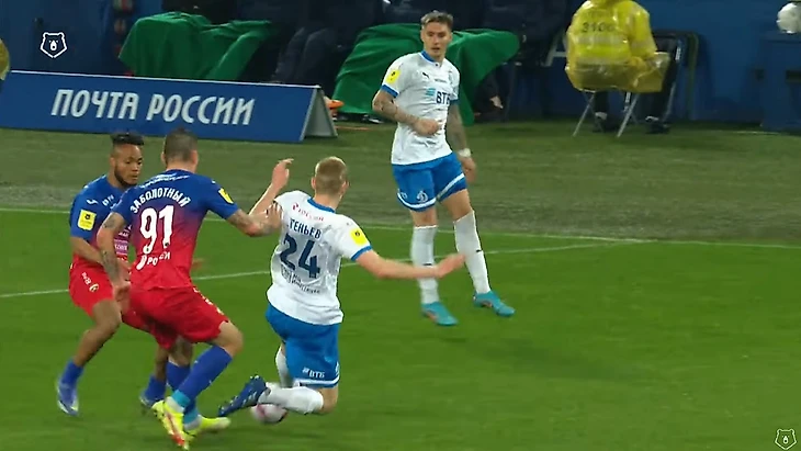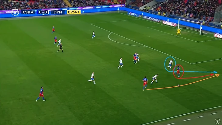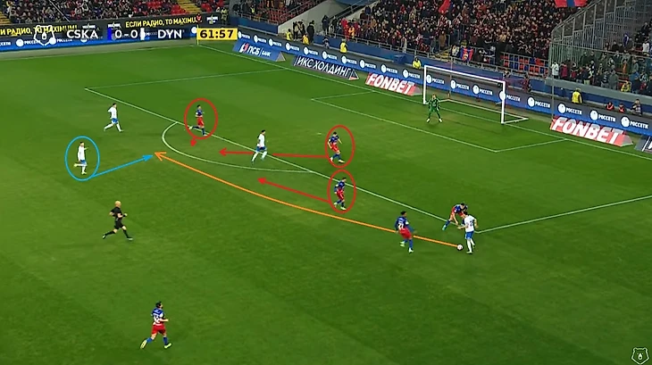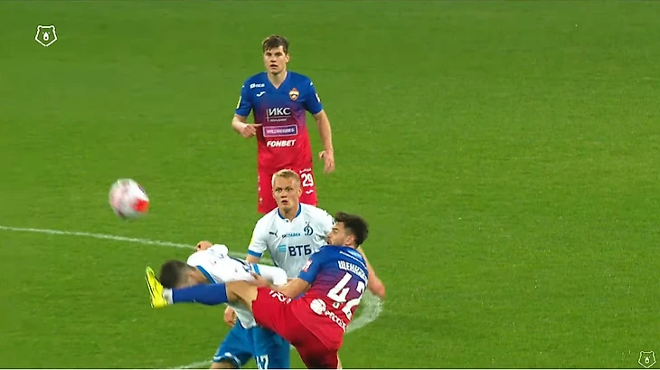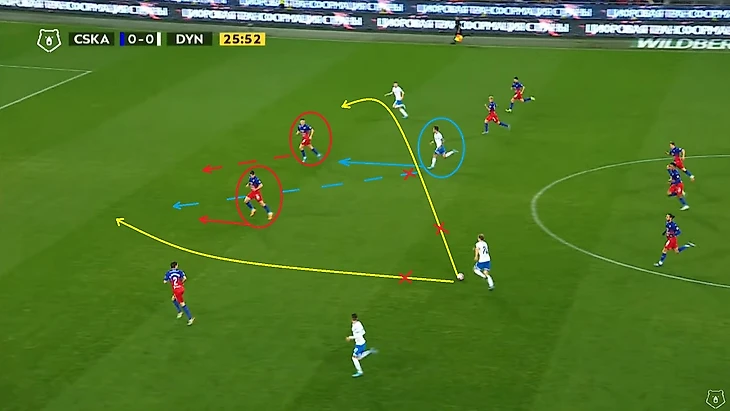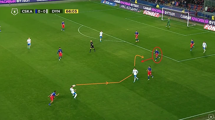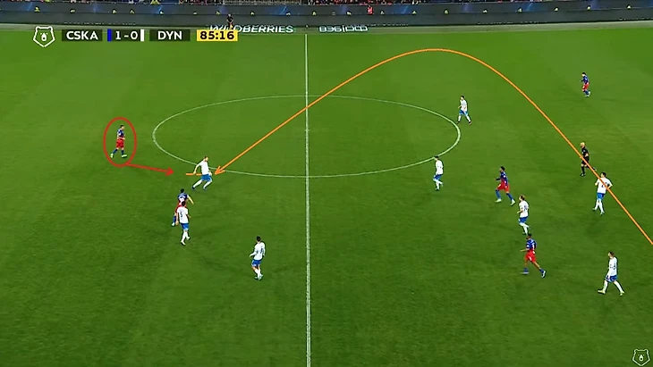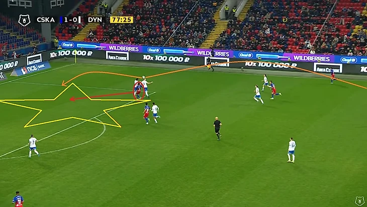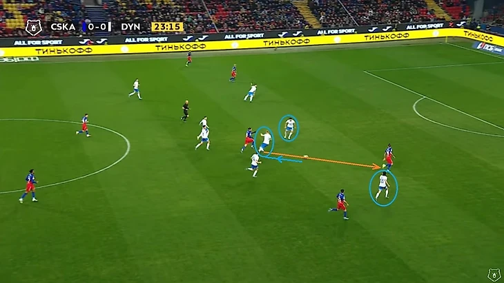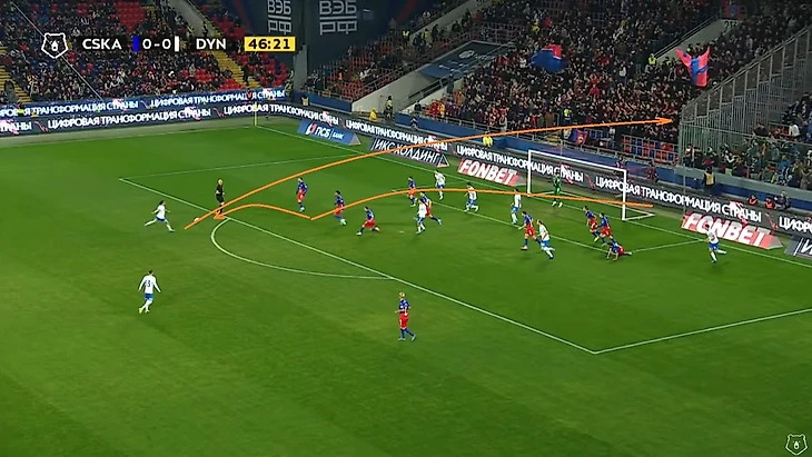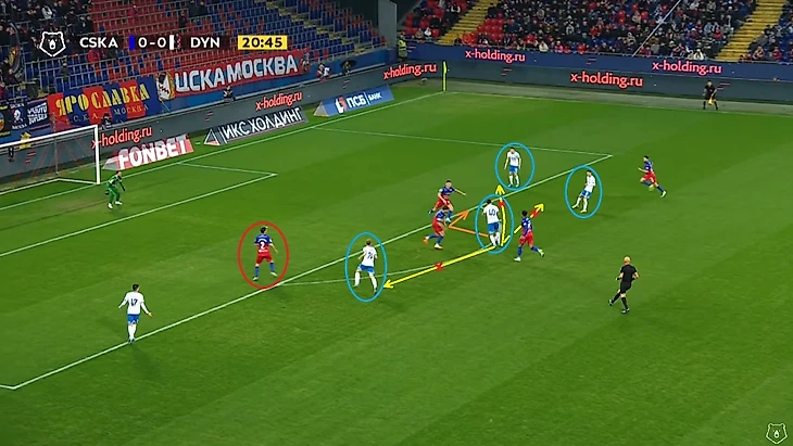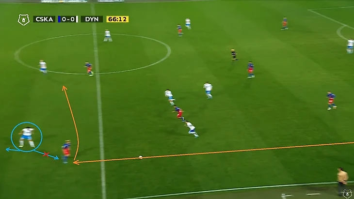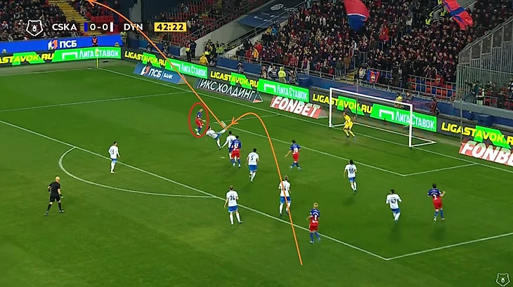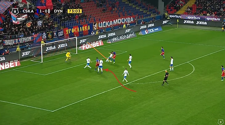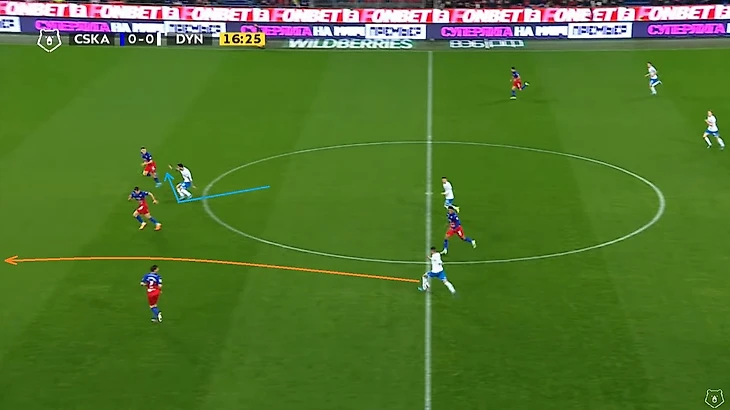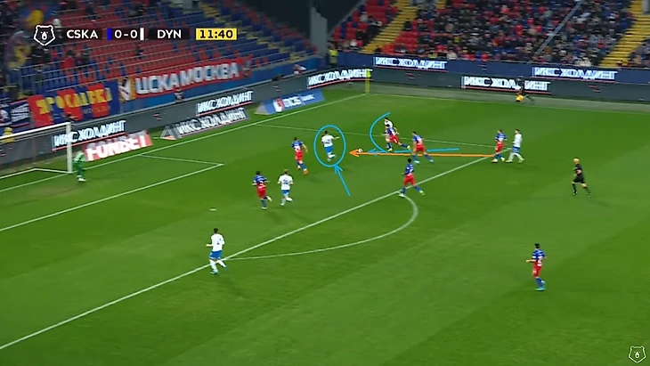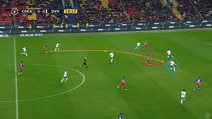 Следующие пять минут также проходят с нашим преимуществом, хотя ЦСКА и удалось потревожить Шунина, но поднятый флажок линейного арбитра лишил Антона хорошего спасения. Обратите внимание, что уже не в первый раз наши соперники разрезают центр нашей обороны, но об этом я подробнее расскажу в выводах об игре. И большую ошибку в этом эпизоде совершил не Евгеньев, а Бальбуэна — если бы Фабиан первым выдвинулся на соперника, то Евгеньев остался бы со своим оппонентом, имея лучшие шансы для перехвата мяча.