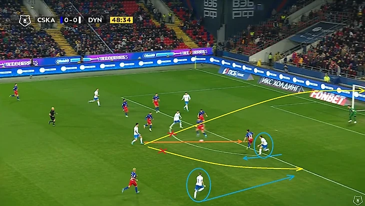 Ключевой фигурой первого тайма снова становится Смолов. На фото прекрасно видно, что Федя видит справа Макарова, а значит логично (по моей футбольной логике) нужно ускоряться от Дениса ближе в центр. Таким образом и ты будешь в свободной зоне, и одного игрока от партнёра уведёшь. Но нет, Федя снова идёт в направлении Макарова, а затем встаёт на пути мяча — момент упущен.
