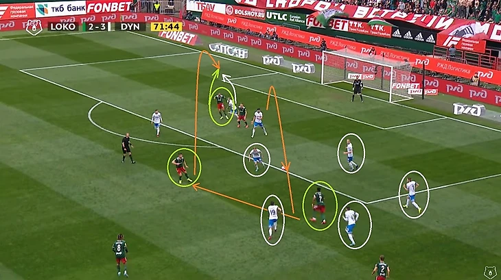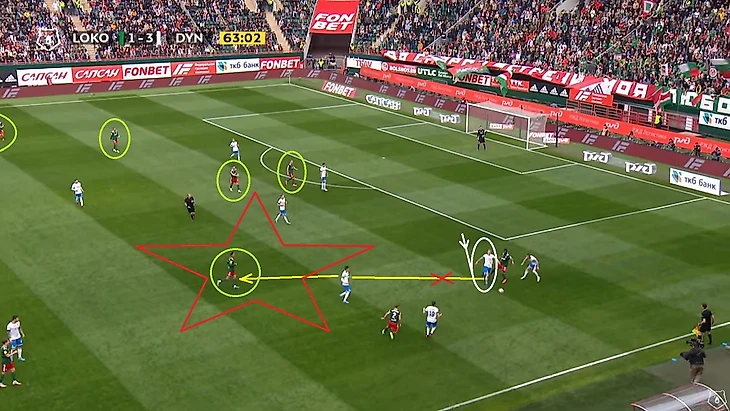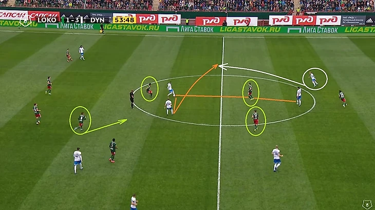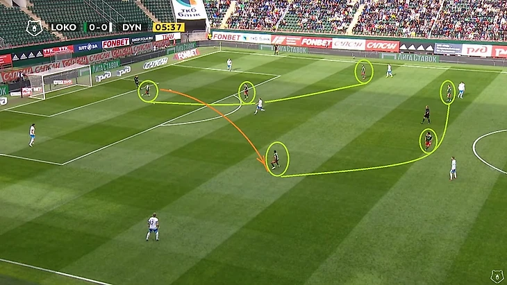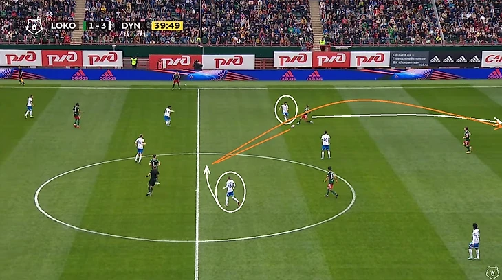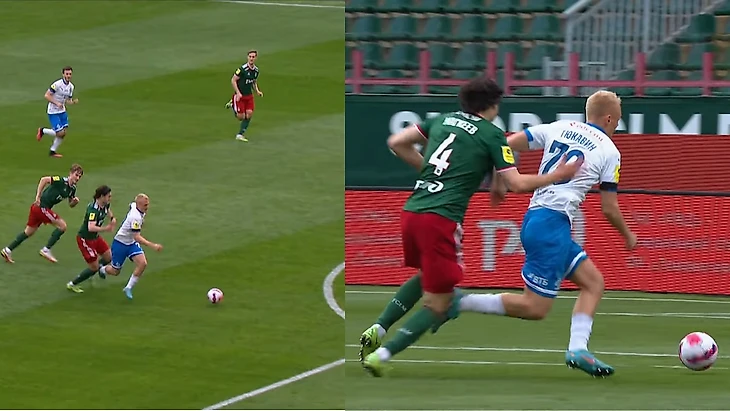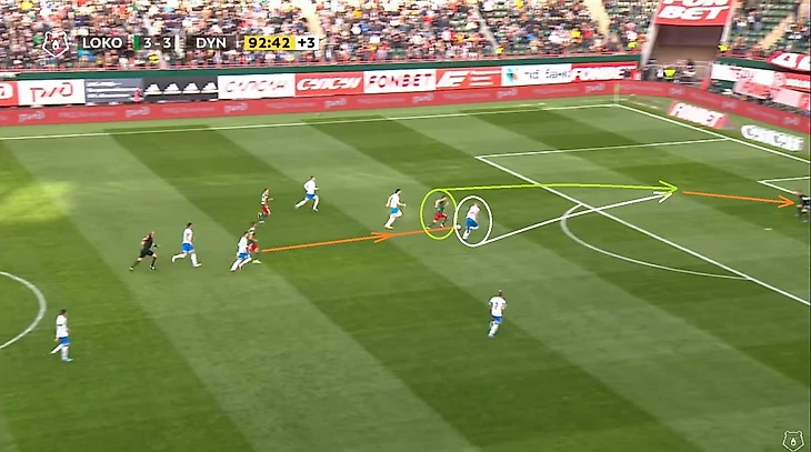 После гола Локомотив, словно набрав ход, провёл ещё одну хорошую атаку, правда отменённую офсайдом. Чтобы восстановить статус-кво Динамо потребовалось 5 минут, а на голевую атаку ушло всего 20 секунд: Лесовой прессингует на левом фланге, после чего мы вводим мяч из-за боковой, Скопинцев продвигается немного дальше и выкатывает мячик Арсену. Я часто ругал наших опорников, что не накрывают соперника перед воротами, и вот такую же ошибку допускают игроки Локомотива — лишняя секунда на обработку и прицел, и у Арсена исполняет шикарный удар в дальний угол. 1:2.