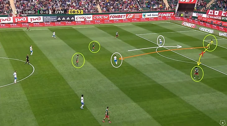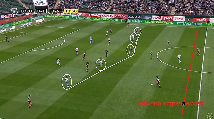 На фото ниже видна расстановка Локомотива. Не могу сказать, что Хапов опытный тренер, но он отлично разобрал игру нашей команды, и выставил самую неудобную для нас схему с тремя нападающими. И это чуть не дало свои плоды на шестой минуте, после того как Шунин под прессингом выбил мяч точно в ноги сопернику. В этот раз красно-зелёные нас простили, да и Варела удачно заблокировал удар после «отскока» от Скопинцева.