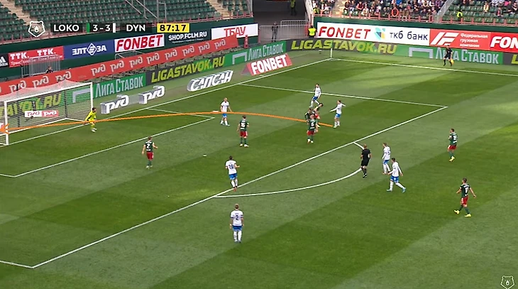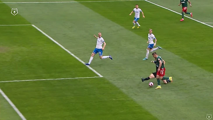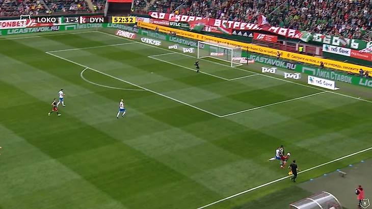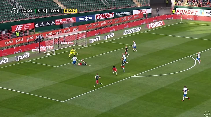 Перед матчем Динамо опубликовало небольшую статью со статистикой, по которой Локомотив был худшей командой по пропущенным голам с дальней дистанции и теперь мы видим почему. В редкой атаке справа о себе напомнил Нжи, но его прострел был перехвачен защитниками, хотя задумка была хорошей. А через две минуты судья назначает бесспорный пенальти за снос Смолова, который был уверенно реализован Даниилом Фоминым — 1:3.
