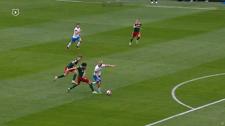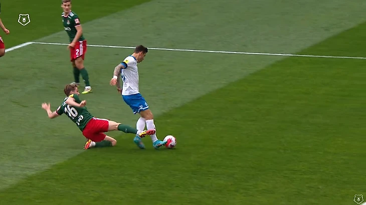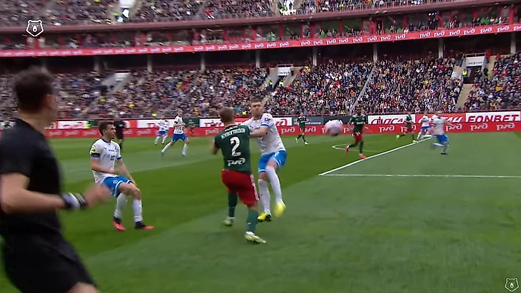 Непонятно за что дали жёлтую карточку Скопинцеву на 56-ой минуте. Как видно на фото ниже, контакта почти не было, а Живоглядов покатился по полю так, как будто против него применили хоккейный силовой приём. На подачу с этого штрафного Шунин уверенно вышел и забрал мяч.