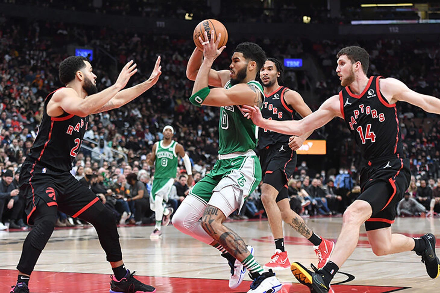 Тейтум прекрасно владеет своим телом, и я уверен, что его главная сила – не в бросках через руки, а в проходах под кольцо и оформлении вида на жительство на линии штрафного броска. На его стороне уникальное сочетание техники и мощи, он может и евростепами голову вскружить, и завершить проход с контактом почти любой сложности, каскад финтов в духе «евростеп после пампфейка через степбэк» тоже в наличии. Часто ли он этой своей суперсилой пользуется? Ну так. Ну такое. Чаще, например, чем Дюрэнт с Яннисом, но в целом показатель держится на собственном уровне прошлых сезонов. Думаю, что Тейтум должен лезть под кольцо чаще раза так в полтора, чем он делает это сейчас, догнав по этому показателю главных умельцев – Моранта, Дончича, Гилджеса-Александра.