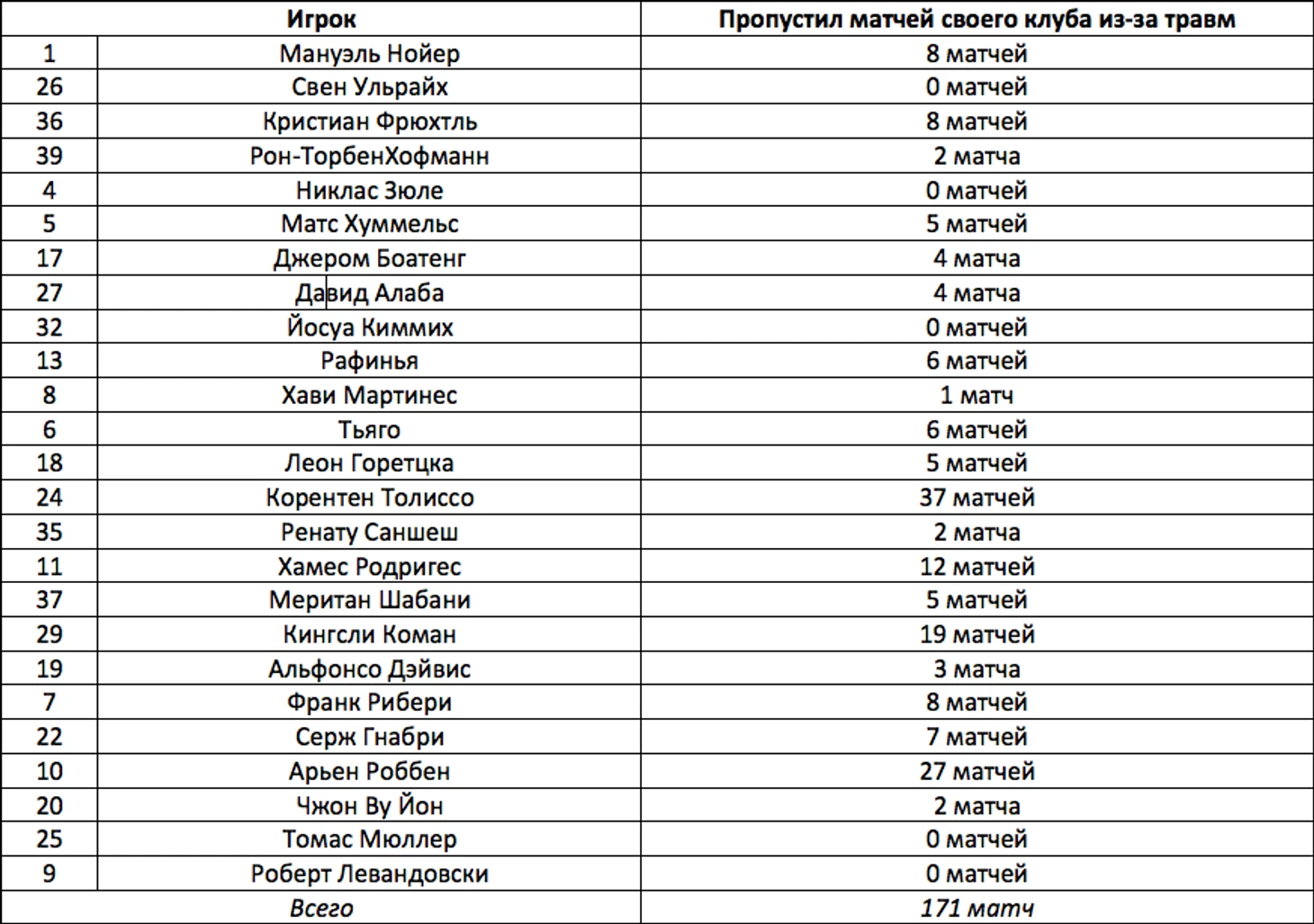 В текущем сезоне, в общей сложности, игроки «Баварии» пропустили из–за травм 171 матч