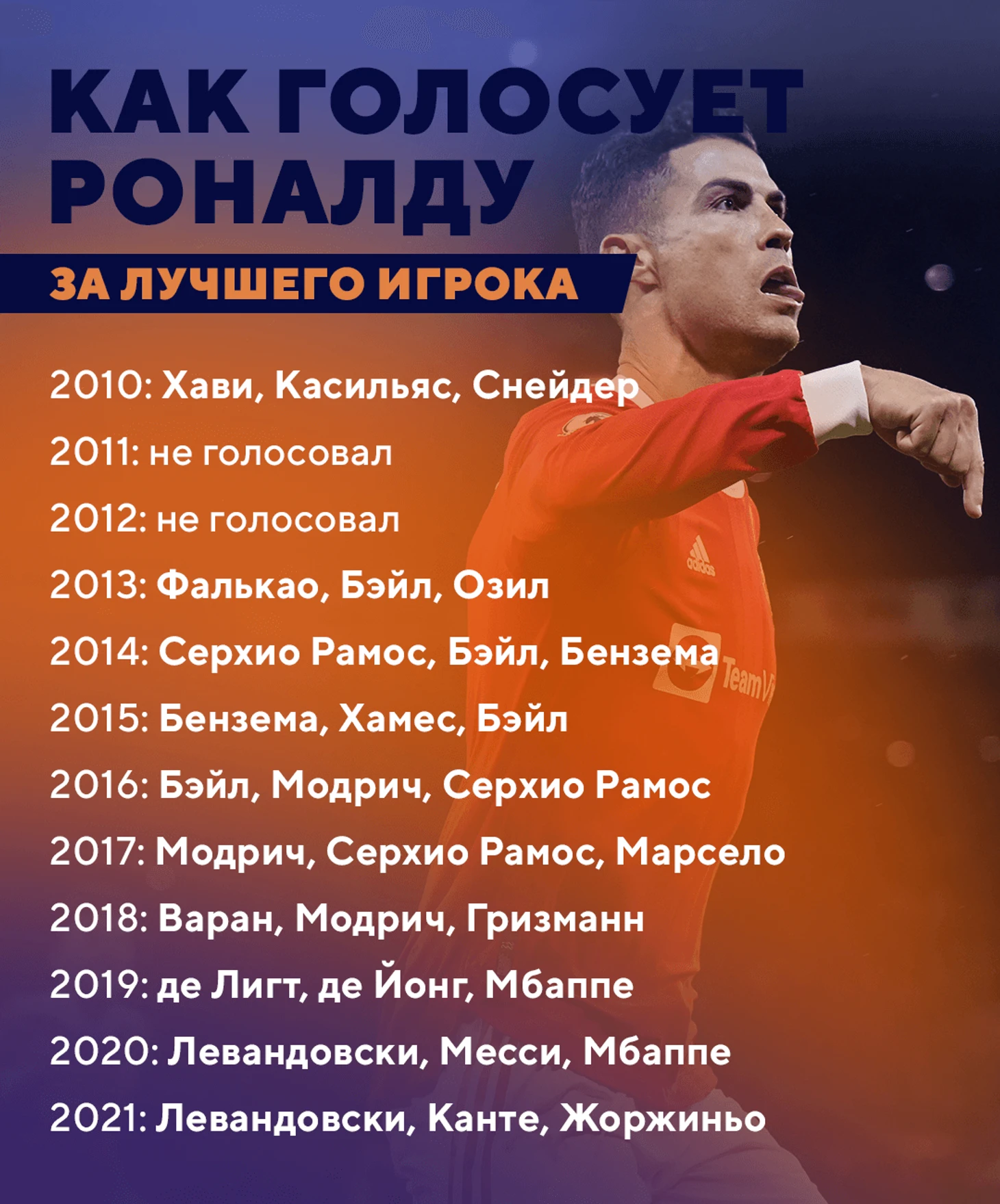 Правда, в тройке у него тоже в основном были партнеры по «Реалу». До 2018-го он включал в топ не из «Мадрида» только Хави, Снейдера и Фалькао. После 2013-го долгий перерыв – лишь в 2018-м на третье место забрался Гризманн, в 2019-м первым стал партнер по «Юве» – де Лигт. Все остальные кандидаты в 2019-2021 годах представляли другие клубы.