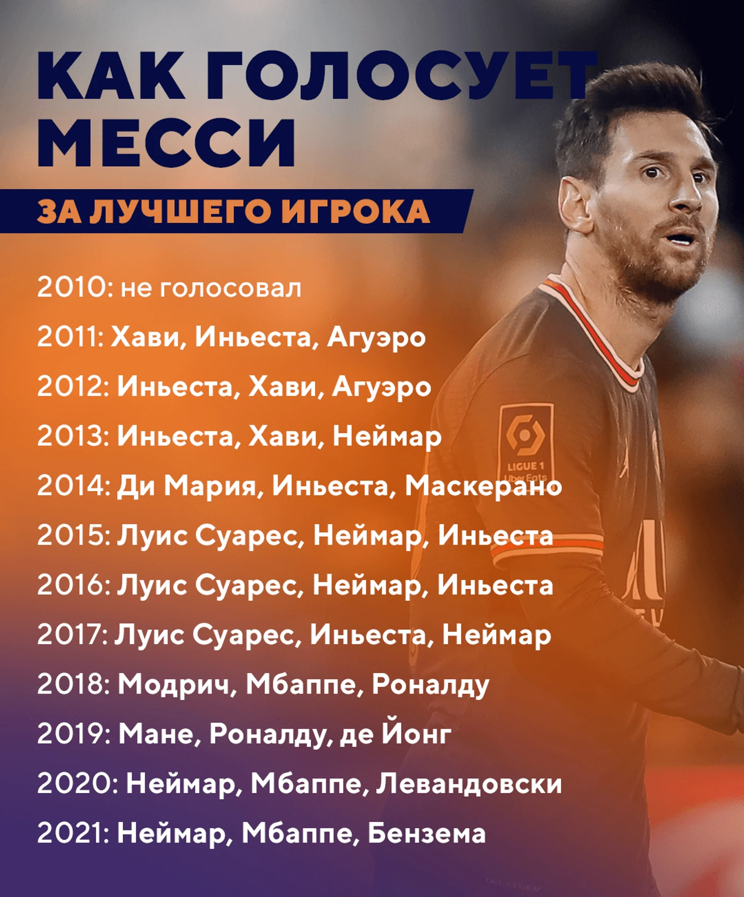 • Лео лишь два года ставил на первое место не партнера по клубу или сборной – Модрича в 2018-м и Мане в 2019-м (забавно, что это совпало с попаданием в тройку Криша). Все остальное время это были партнеры (в том числе бывшие – как Неймар в 2020-м) либо по «Барселоне», либо по «ПСЖ», либо по сборной Аргентины (Ди Мария в 2014-м).