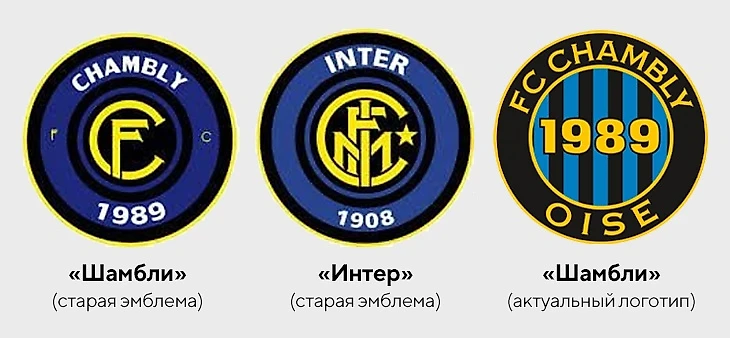 Например, французский «Шамбли» и «Интер». «Шамбли» был основан в 1989 году братьями Лузи – итальянцами по происхождению и фанатами «Интера», чей логотип они и скопировали. Правда, сейчас у команды, выступающей в третьем дивизионе, уже другой лого (но все равно похож).