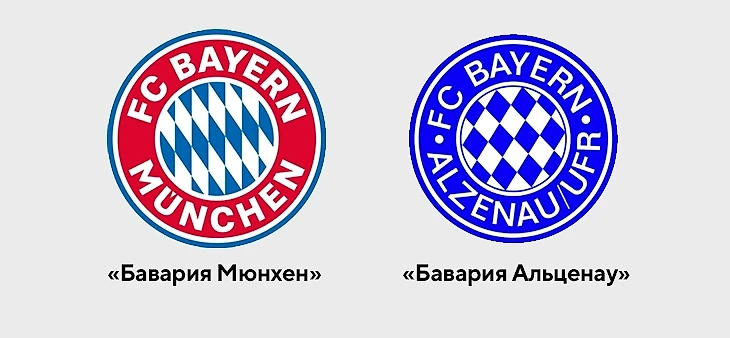 А вот логотипы «Баварии Альценау» (примерно пятый уровень в системе немецкого футбола) и «Баварии» Мюнхен. Думаете, «Альценау» скопировал эмблему у топчика? Скорее наоборот: по словам любителей, их лого придумали в 1920-х, а эмблема «Баварии» в современном круглом виде появилась только в 1960-х.