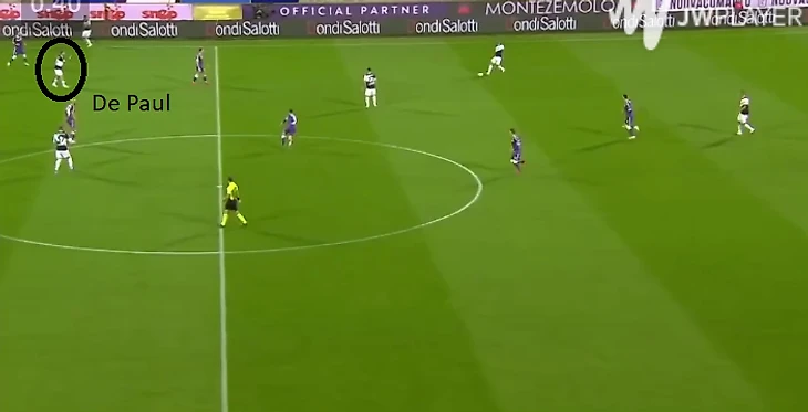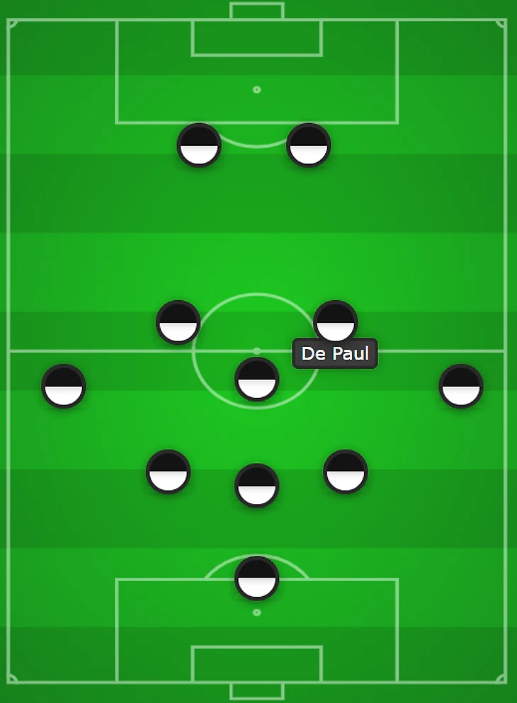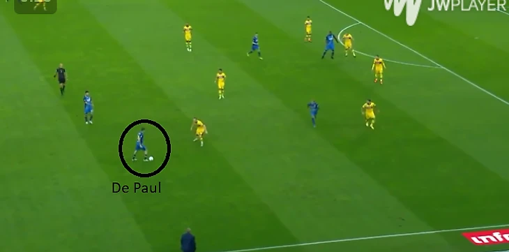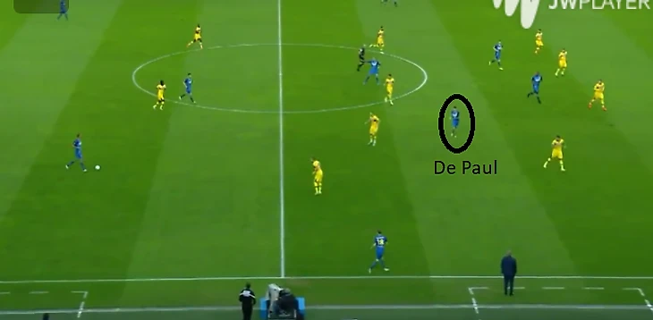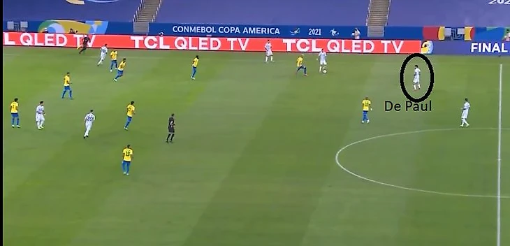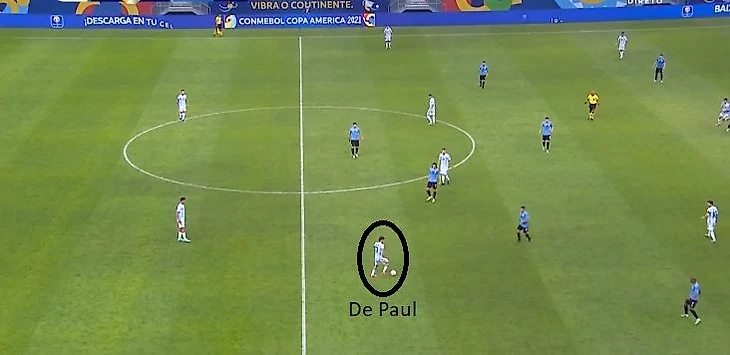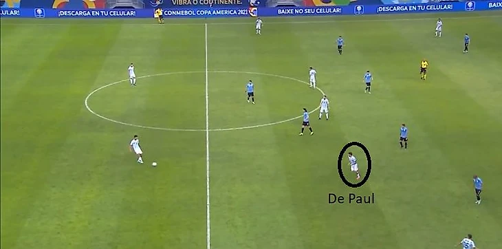 Аргентина построила схему 4-4-2 без мяча, которая затем стала больше похожа на схему 4-3-3 с мячом. Стартовая позиция Де Пауля не слишком сильно отличалась от позиции в «Удинезе». Но дома в Удине он был одним из трех наиболее высоко расположенных игроков и тем, кто делает разницу в атаке, а в сборной он играл одну из 8-ок в тройке рядом с Ло Чельсо, который также любит и умеет поддержать атаку.