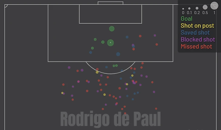 Если вы посмотрите на показатели ударов Де Пауля по сравнению с его xG на один удар, вы можете заметить, что в прошлом сезоне он делал в среднем 2,22 удара за 90 минут, что помещает его в 96-й процентиль, то есть очень высокий, тогда как его xG на один удар составляет всего 0,06 что помещает его в 46-й процентиль.
