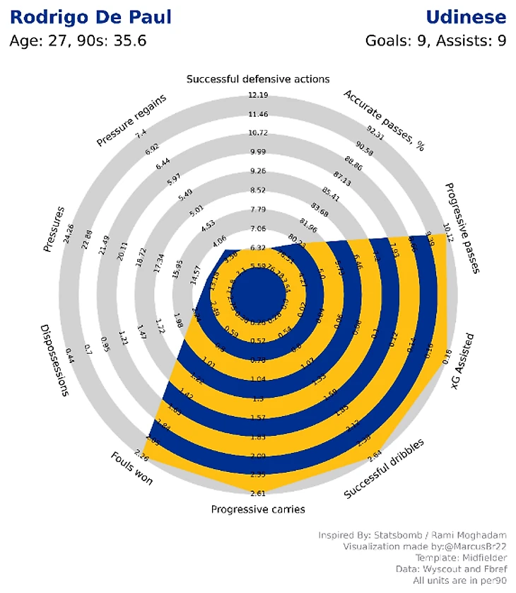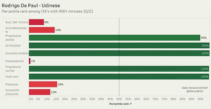 Сложно найти игроков с лучшими атакующими показателями, чем у Де Пауля, поскольку он чрезвычайно хорош в продвижении и творческой работе. В большинстве ситуаций он продвигает мяч вперёд так, как это лучше всего подходит для конкретной ситуации. Он так же хорош и в разрезании линий передачами. На гистограмме (картинка №2) мы видим, к какому процентилю он относится в каждой категории, и ни один другой полузащитник не может похвастаться тем, что он находится в наивысшем процентиле в четырех из десяти категорий (т.е. 3-4 лучших среди пяти лучших лиг). Так же четко он выделяется и в другом направлении, где очень часто теряет мяч, в то время как его процент ошибок в пасовой игре довольно высок. Его оборонительные показатели также значительно ниже среднего.