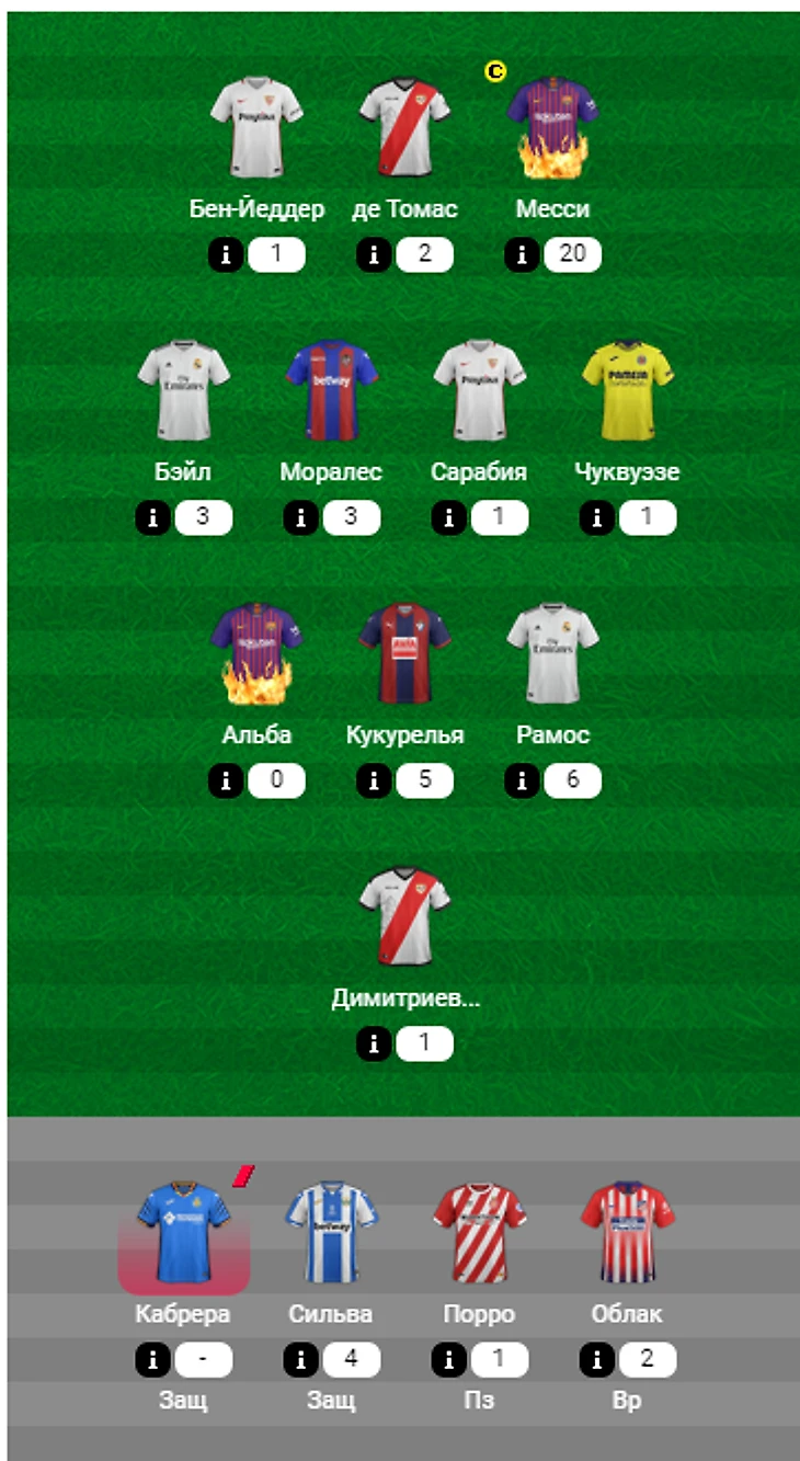 Первым делом уберем подальше Арьяса. Дерби мадрильяно не очень располагает к сухарям, так что взамен колумбийца купим отсидевшего Кабреру. Второй ход коснется дисквалифицированного Альбы взамен которого выйдет валенсиец Габриэл.