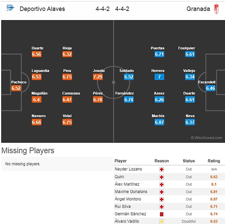 Занятно, что синхронно с вратарем Гранады основной голкипер Фернандо Пачеко(5,5) также из-за травмы не вошел в заявку на ближайший тур. А вот главный забивала Алавеса Лукас Перес(7), который пропустил выезд на Ванда Метрополитано из-за ушиба, уже вернулся в общую группу и готов завтра помочь своей команде.