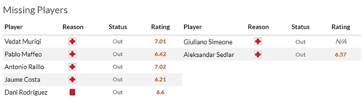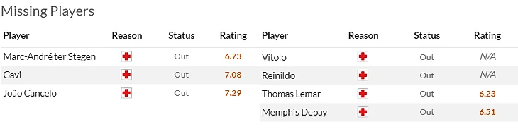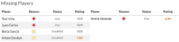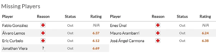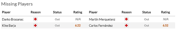 Что касается гостей, то здесь из неприятных новостей – травма отлично начавшего сезон Пабло Барриоса(6,5). Юный полузащитник повредил мениск и не вернется на поле раньше февраля.