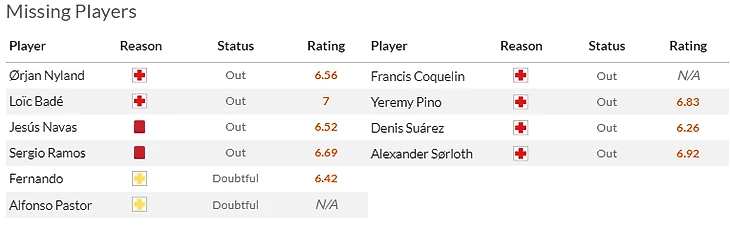 Хозяева поля тоже имеют все поводы для раздражения: вылет из Лиги чемпионов дополняется массовыми дисквалификациями ведущих оборонцев, причем Серхио Рамосу(6,5) за грубость влепили один матч бана, а Хесусу Навасу(6) – два за разговорчивость. К тому же под вопросом сроки восстановления Нюланда(5,5) и Сумаре(6).