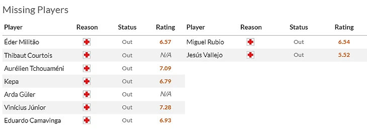 Что касается Реала, то тут тренера никто никуда не отпускает (сорян, Бразилия) так что главный вопрос – получится ли быстренько пролечить Кепу Аррисабалагу(6,5). Пока что особой необходимости форсировать его возвращение в рамку нет, но уже скоро испанец должен снова быть готов выйти в старте. А вот Джуд Беллингем(8) по словам Анчелотти готов играть и поможет команде в субботу.